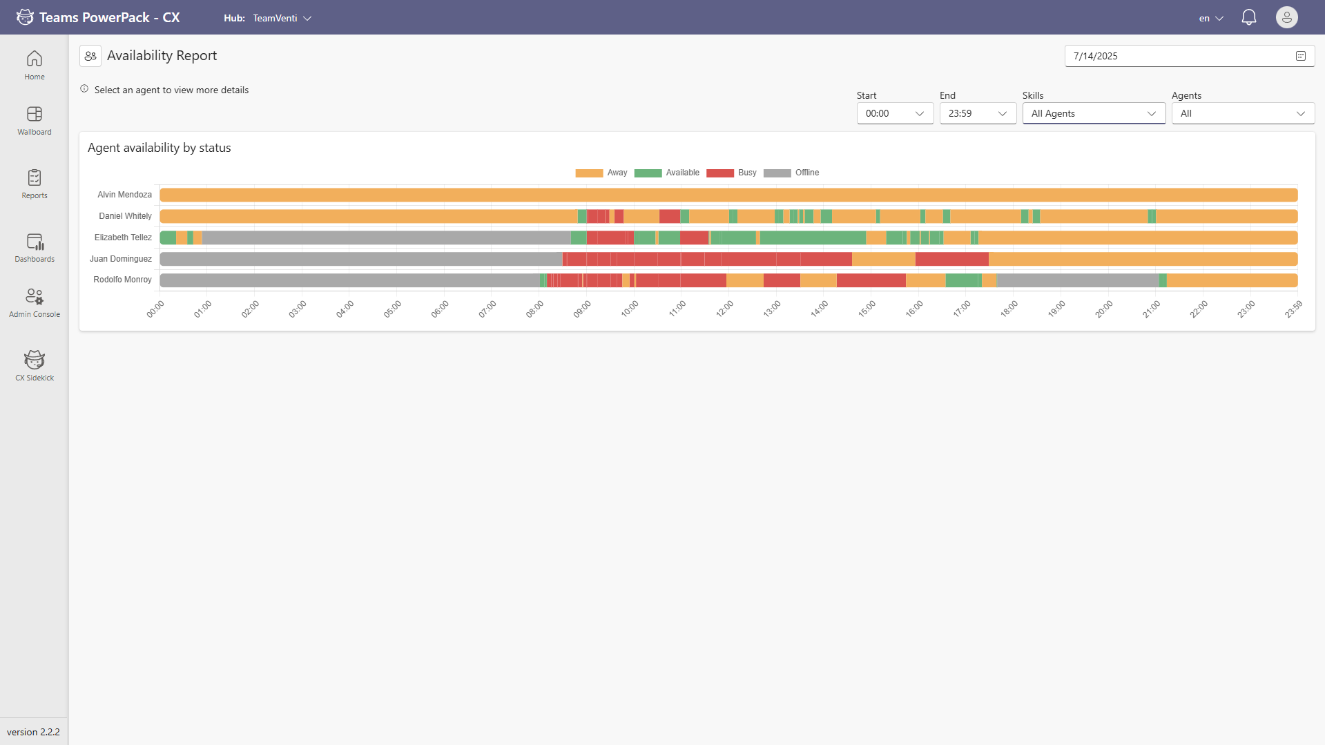 - Agent Presence Grid: This grid displays the Teams presence status (e.g., Available, Busy, Away, Do Not Disturb, Offline) for all active users throughout the chosen date