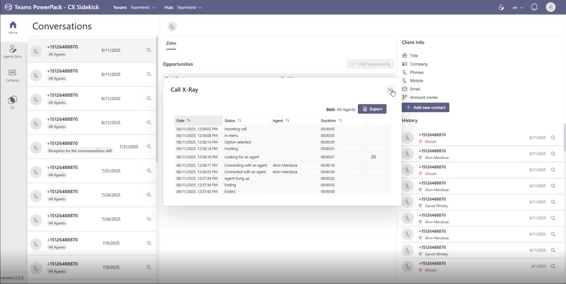Powerful Caller History Section: A new, dedicated Caller History section is now integrated into CX Sidekick. This feature provides agents with instant access to historical information from previous calls by a selected Caller, either from the main Call History or for the current incoming caller via the CX Sidekick Popup.