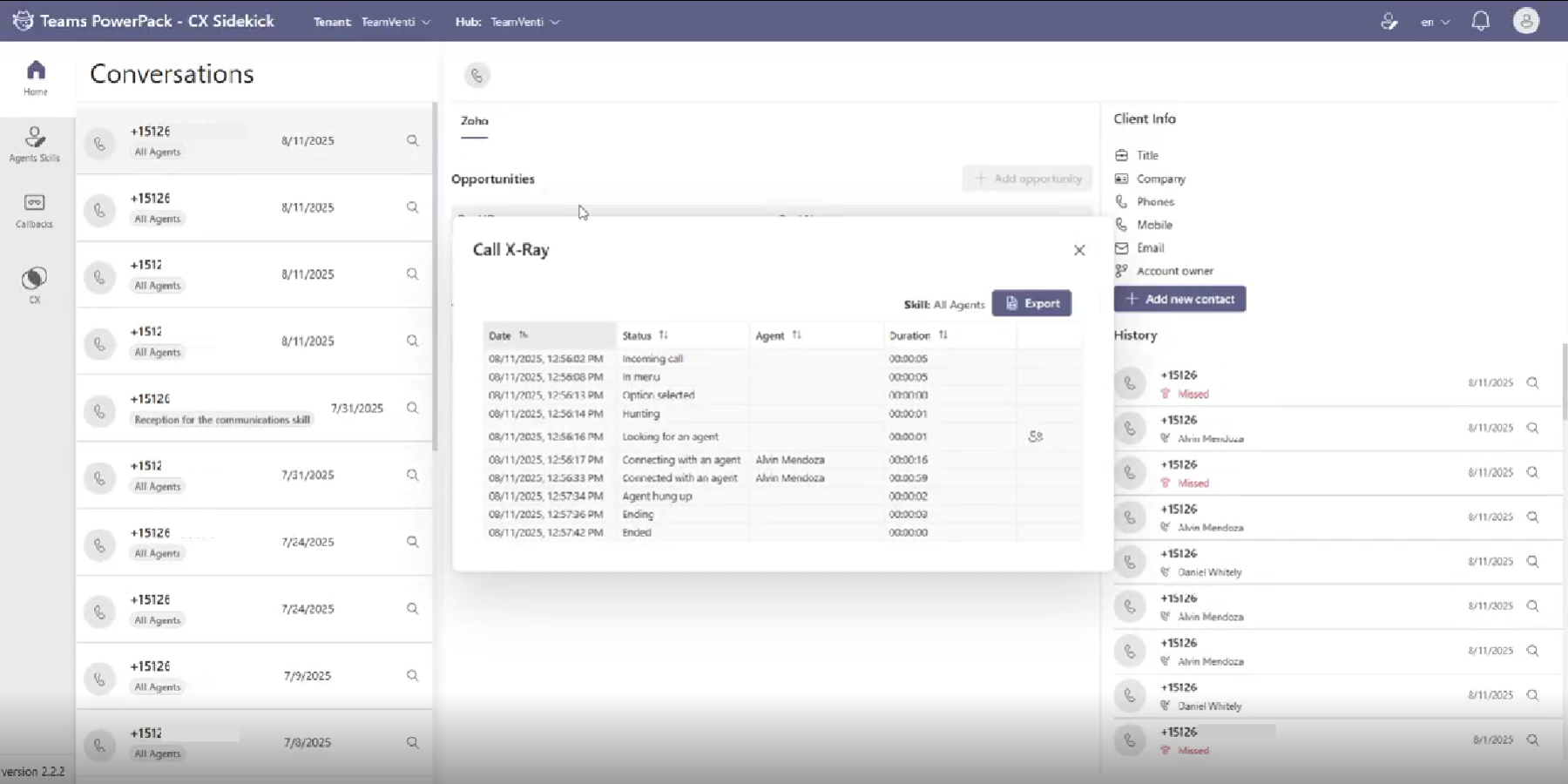 This guide explores the functionalities and features of Teams PowerPack - CX Sidekick application designed for agents within the Teams PowerPack - CX solution. Main Menu: Provides access to call history, caller information, and additional features. ...